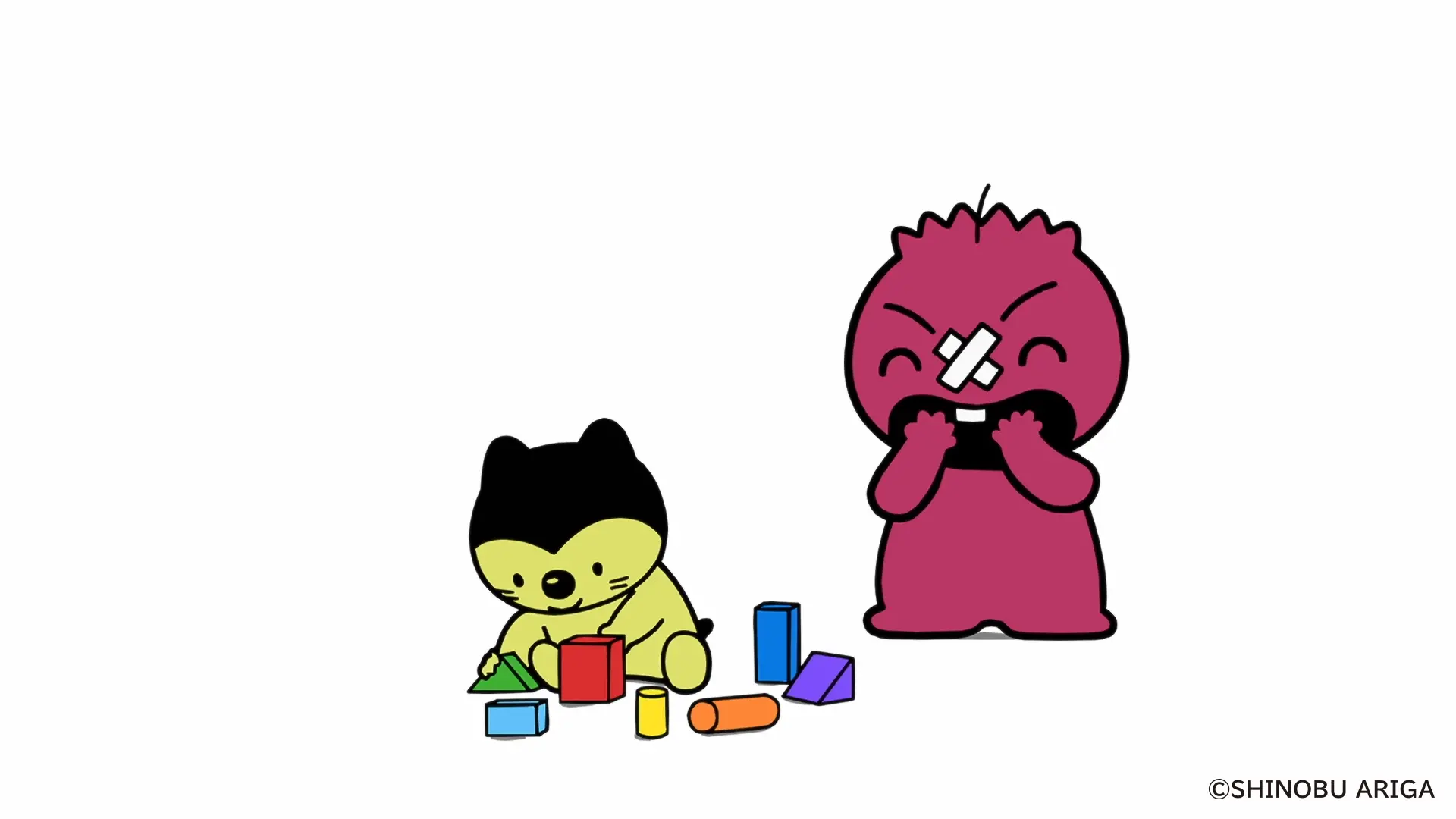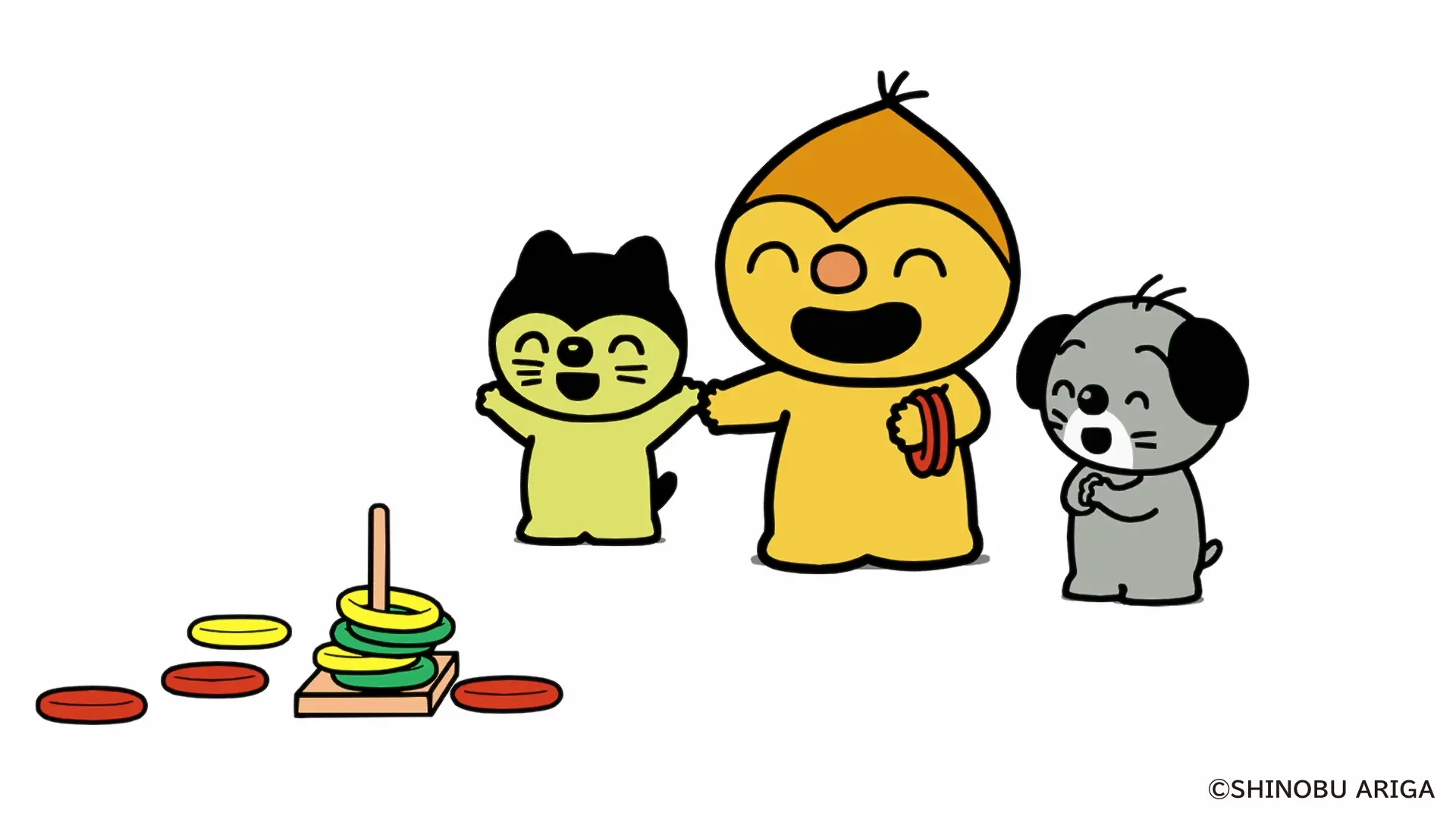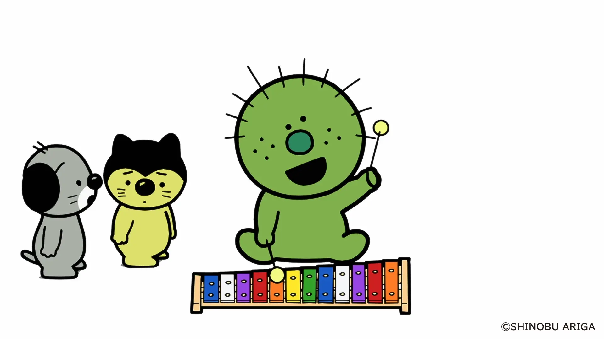 やだもんが鉄琴で遊んでいると、ぺろとみゃーがやってきます。